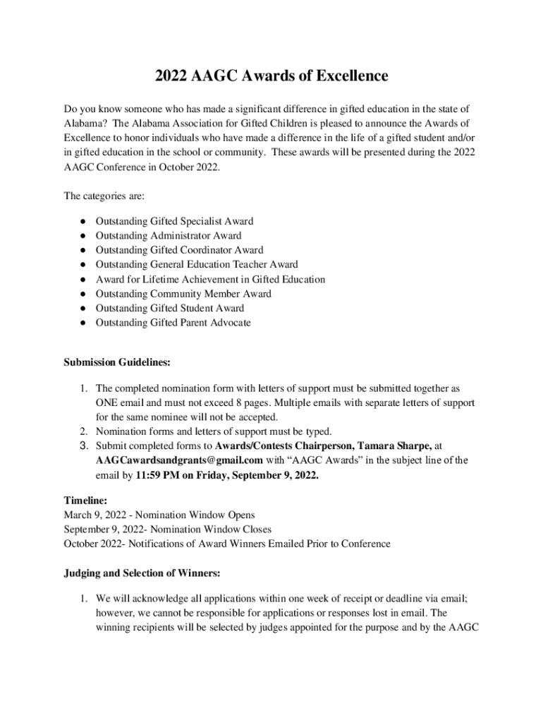 2022 AGC Awards of Excellence Do you know someone who has made a significant difference in gifted education in the state of Alabama? The Alabama Association for Gifted Children is pleased to announce