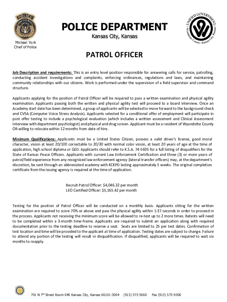 POLICE DEPARTMENT Kansas City, Kansas Michael York Chief of PolicePATROL OFFICER Job Description and requirements: This is an entry level position responsible for answering calls for service, patrolling,