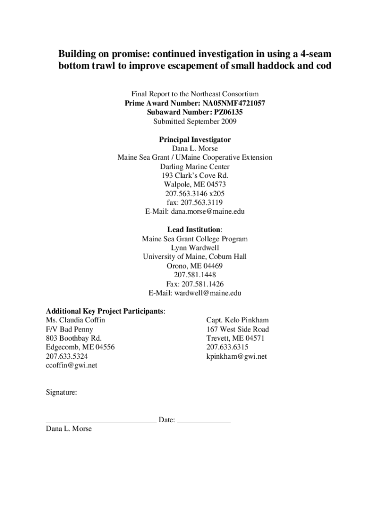 Building on promise: continued investigation in using a 4seam bottom trawl to improve escapement of small haddock and cod Final Report to the Northeast Consortium Prime Award Number: NA05NMF4721057