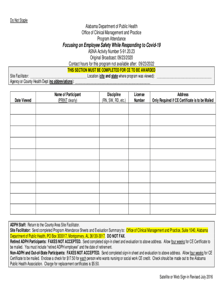 Do Not Staple Alabama Department of Public Health Office of Clinical Management and Practice Program AttendanceFocusing on Employee Safety While Responding to COVID-19 ASIA Activity Number 591.20.23