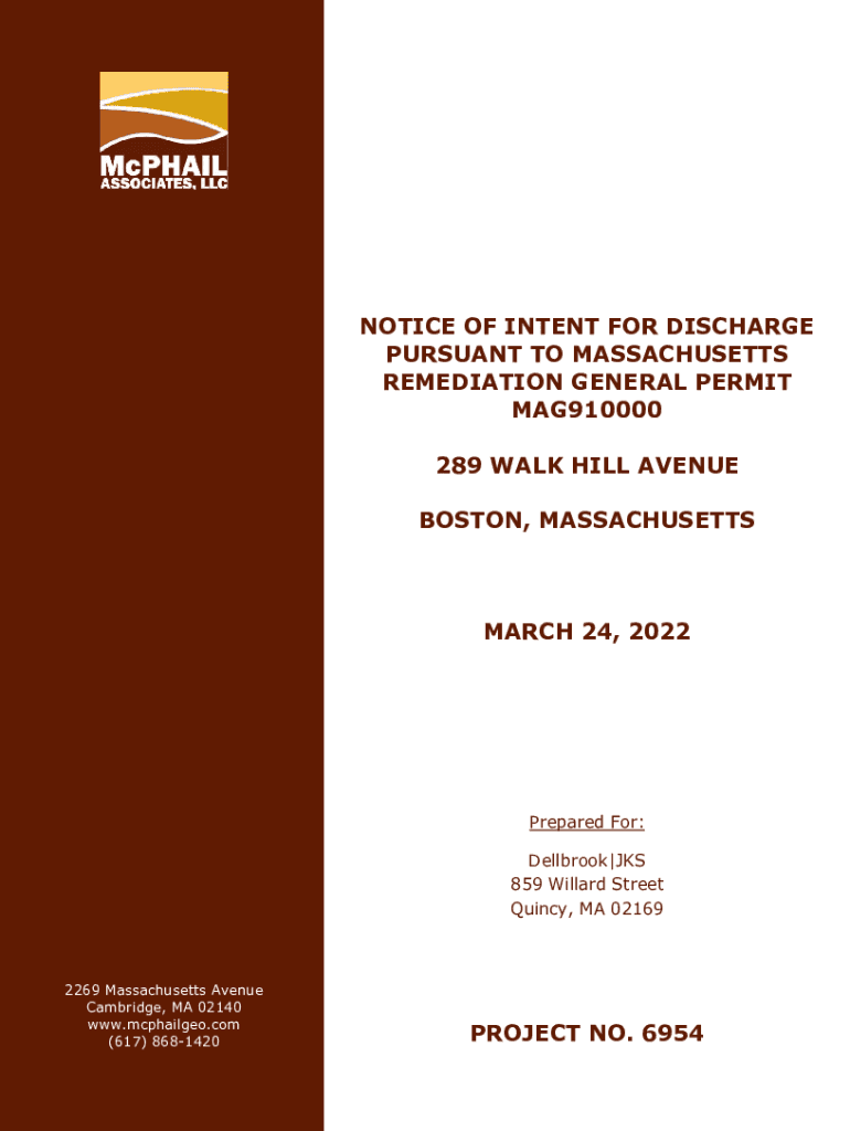 NOTICE OF INTENT FOR DISCHARGE PURSUANT TO MASSACHUSETTS REMEDIATION GENERAL PERMIT MAG910000 289 WALK HILL AVENUE Bostons, MASSACHUSETTSMARCH 24, 2022Prepared For: Dell brook×JCS 859 Willard Street