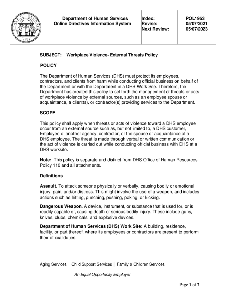 Department of Human Services Online Directives Information SystemSUBJECT:Index: Revise: Next Review:POL1953 05/07/2021 05/07/2023Workplace Violence External Threats PolicyPOLICY The Department of