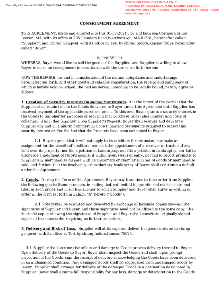 DocuSign Envelope ID: F82315F48B564132BFA90207F0CBE2B4DEMONSTRATION DOCUMENT ONLY PROVIDED BY DocuSign ONLINE SIGNING SERVICE 999 3rd Ave, Suite 1700 Seattle Washington 98104 (206) 2190200 www.docusign.comCONSIGNMENT