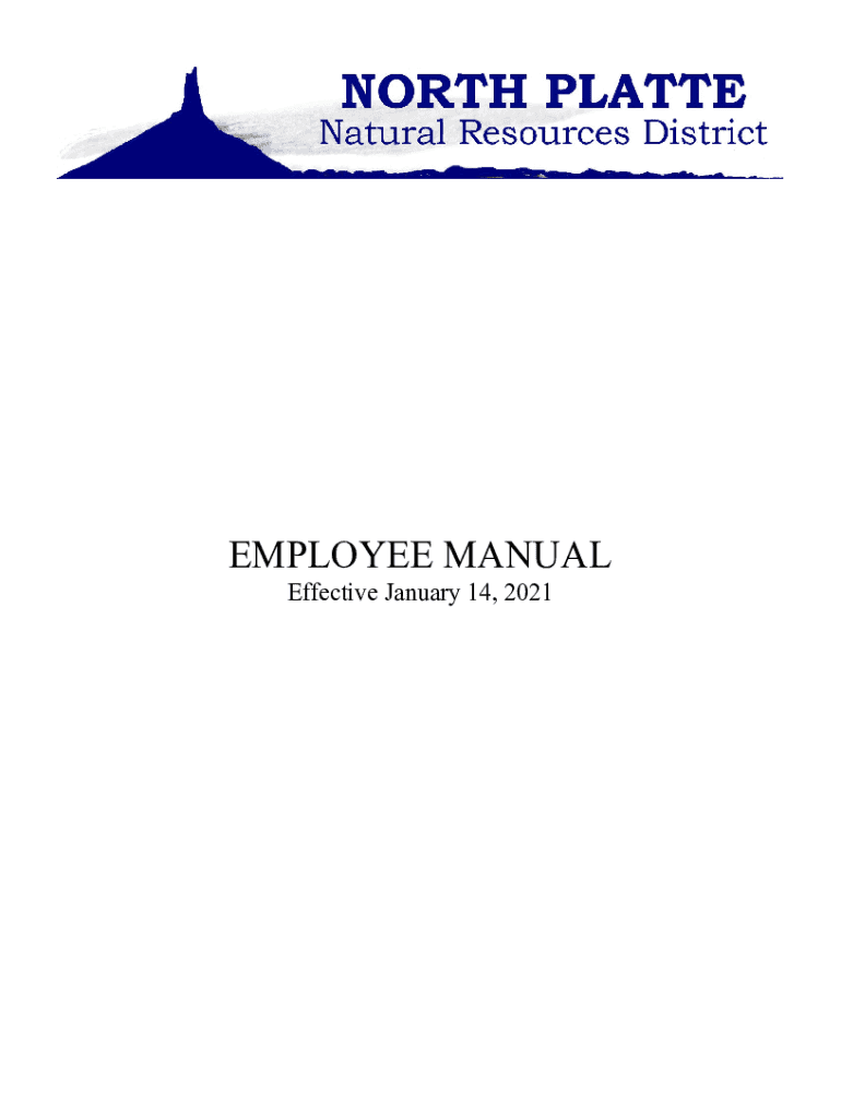 EMPLOYEE MANUAL Effective January 14, 2021NORTH PLATTE NATURAL RESOURCES DISTRICT An Equal Opportunity EmployerWELCOME The North Platte Natural Resources District takes this opportunity to extend
