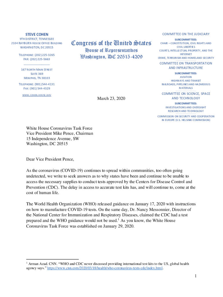 STEVE COHENCOMMITTEE ON THE JUDICIARY9TH DISTRICT, TENNESSEE 2104 RAYBURN HOUSE OFFICE BUILDING WASHINGTON, DC 20515SUBCOMMITTEES: CHAIR CONSTITUTION, CIVIL RIGHTS AND CIVIL LIBERTIES COURTS, INTELLECTUAL