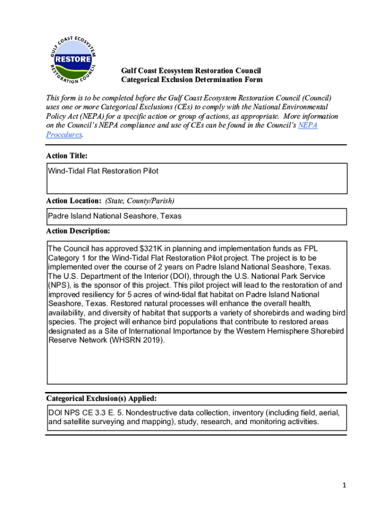 Gulf Coast Ecosystem Restoration Council Categorical Exclusion Determination Form This form is to be completed before the Gulf Coast Ecosystem Restoration Council (Council) uses one or more Categorical