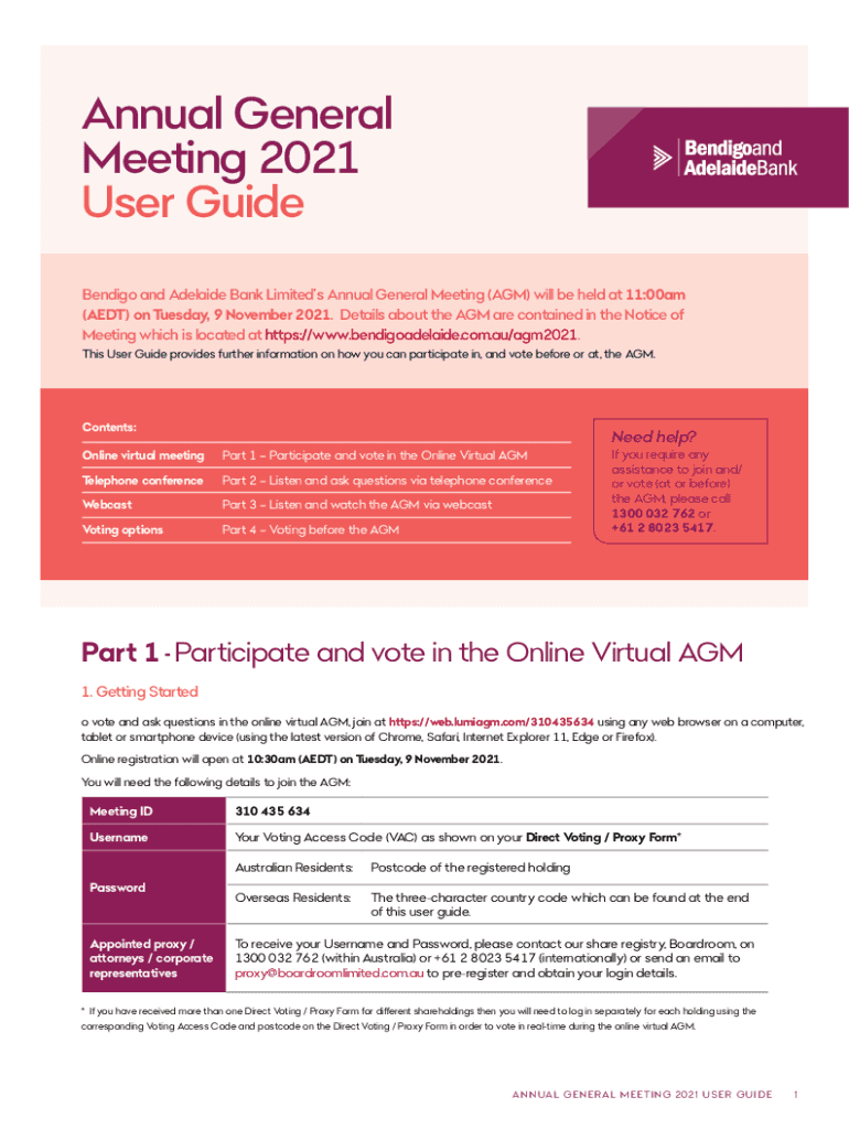 Annual General Meeting 2021 User Guide Bendigo and Adelaide Bank Limited Annual General Meeting (AGM) will be held at 11:00am (ADT) on Tuesday, 9 November 2021. Details about the AGM are contained