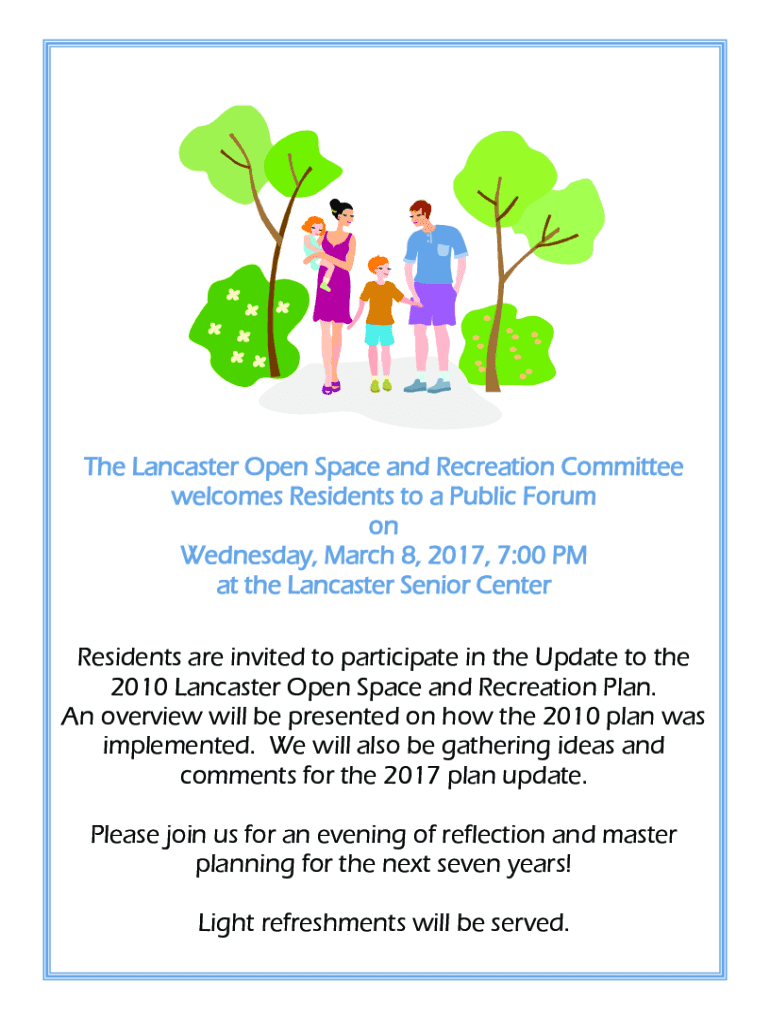 The Lancaster Open Space and Recreation Committee welcomes Residents to a Public Forum on Wednesday, March 8, 2017, 7:00 PM at the Lancaster Senior Center Residents are invited to participate in the
