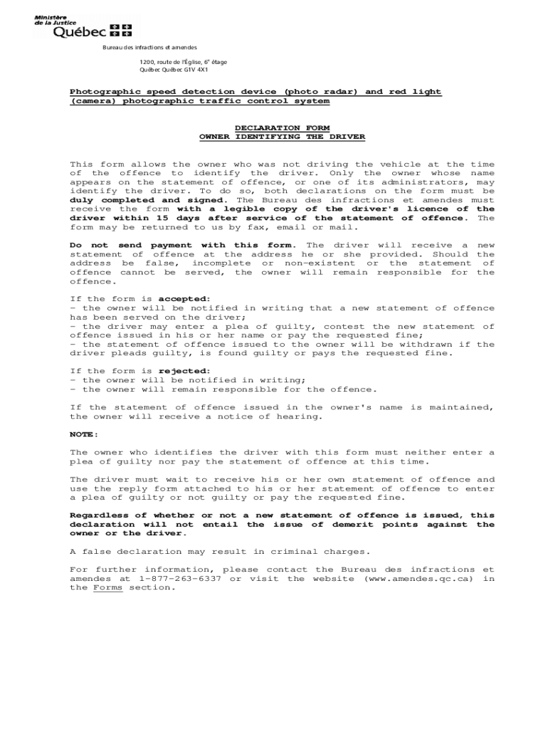 Bureau DES infraction set amended 1200, route de Louise, 6e age Quebec G1V 4×1Photographic speed detection device (photo radar) and red light (camera) photographic traffic control systemDECLARATION