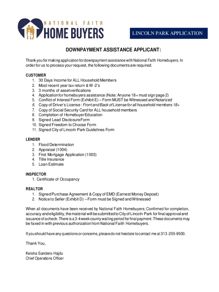 LINCOLN PARK APPLICATION Down payment ASSISTANCE APPLICANT: Thank you for making application for down payment assistance with National Faith Homebuyers. In order for us to process your request, the