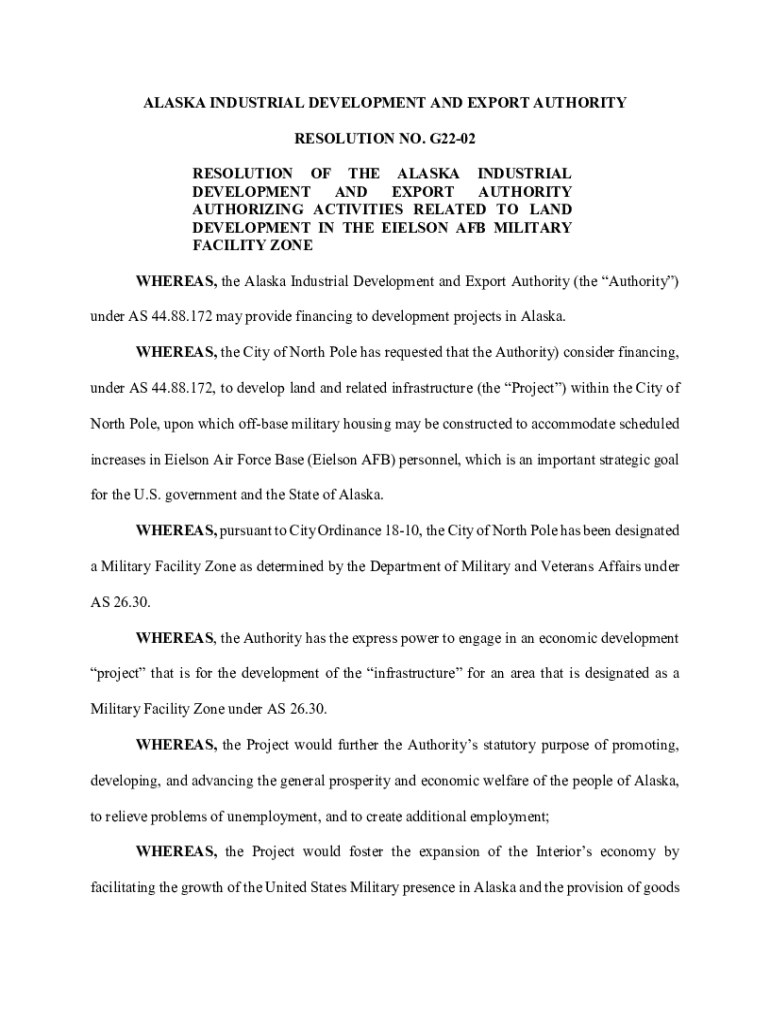ALASKA INDUSTRIAL DEVELOPMENT AND EXPORT AUTHORITY RESOLUTION NO. G2202 RESOLUTION OF THE ALASKA INDUSTRIAL DEVELOPMENT AND EXPORT AUTHORITY AUTHORIZING ACTIVITIES RELATED TO LAND DEVELOPMENT IN THE