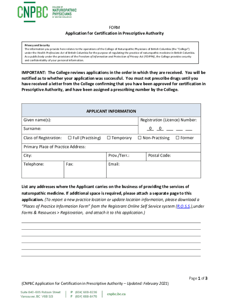 FORM Application for Certification in Prescriptive Authority Privacy and Security The information you provide here relates to the operations of the College of Naturopathic Physicians of British Columbia