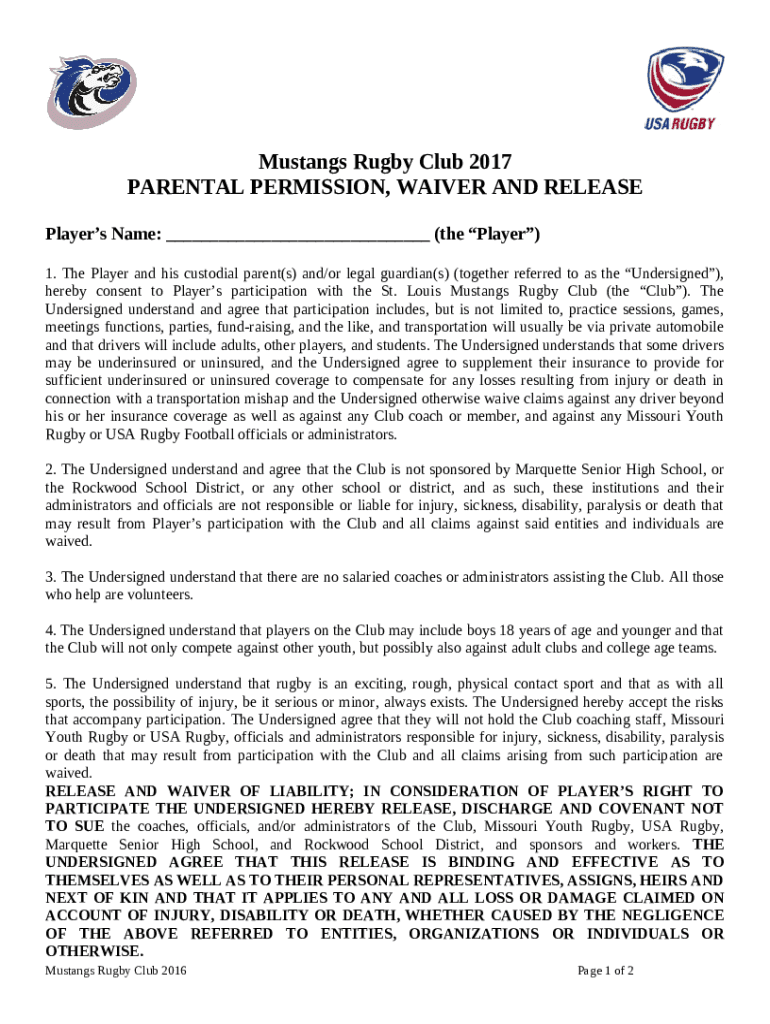 The North Shore Rugby Academy Parental Permission, Waiver and ... is a document needed to be submitted to the required address to provide specific information. It must be completed and signed, which can be done manually, or with the help of a certain solution like PDFfiller. It lets you fill out any PDF or Word document right in the web, customize it depending on your purposes and put a legally-binding electronic signature. Right after completion, user can easily send the North Shore Rugby Academy Parental Permission, Waiver and ... to the relevant receiver, or multiple recipients via email or fax. The template is printable as well due to PDFfiller feature and options presented for printing out adjustment. In both digital and in hard copy, your form will have a clean and professional look. Also you can save it as the template for later, there's no need to create a new document from the beginning. You need just to edit the ready template.