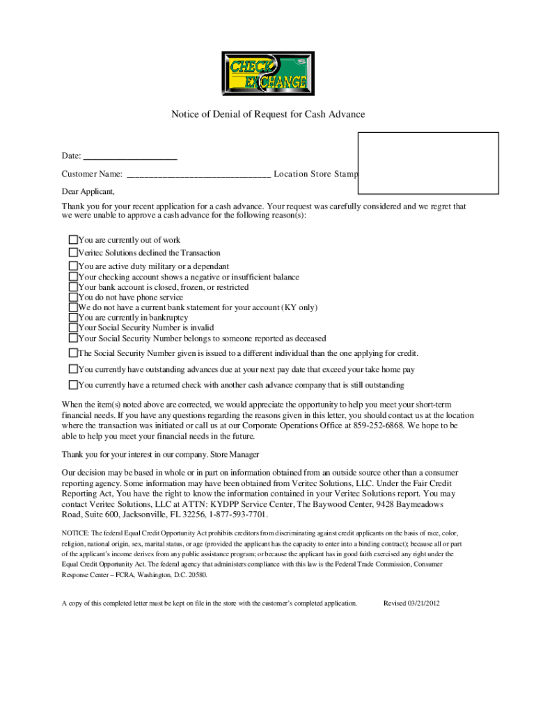 Notice of Denial of Request for Cash Advance Date: ___ Customer Name: ___ Location Store Stamp Dear Applicant, Thank you for your recent application for a cash advance. Your request was carefully