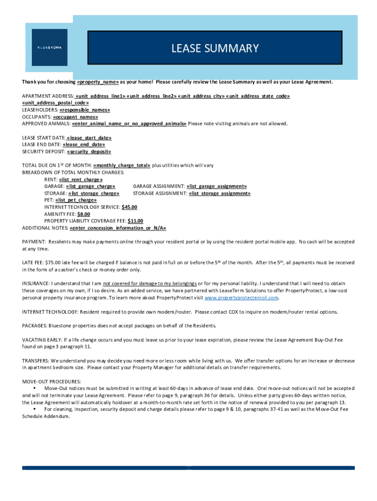 LEASE SUMMARY Thank you for choosing property×name as your home! Please carefully review the Lease Summary as well as your Lease Agreement. APARTMENT ADDRESS: unit×address×line1 unit×address×line2