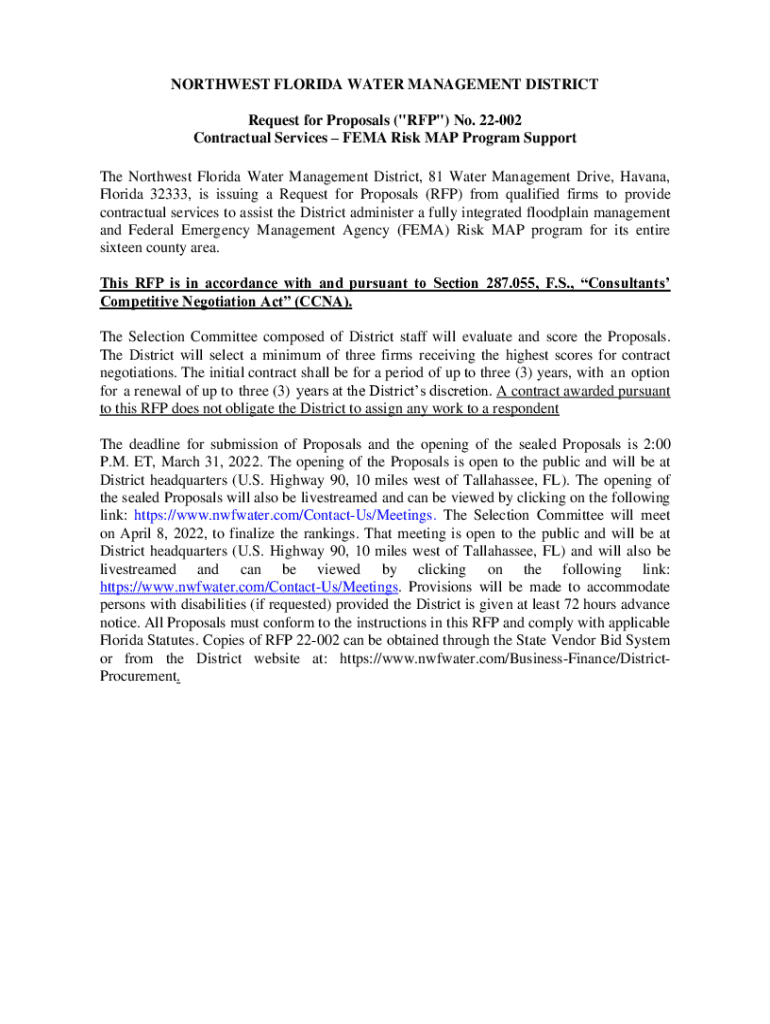 NORTHWEST FLORIDA WATER MANAGEMENT DISTRICT Request for Proposals (\” RFP\”) No. 22002 Contractual Services FEMA Risk MAP Program Support The Northwest Florida Water Management District, 81 Water