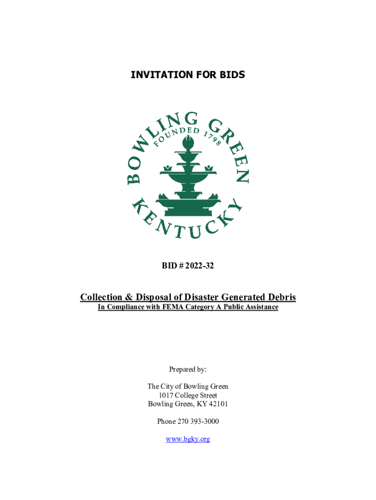 INVITATION FOR BIDS BID # 202232Collection & Disposal of Disaster Generated Debris In Compliance with FEMA Category A Public AssistancePrepared by: The City of Bowling Green 1017 College Street Bowling