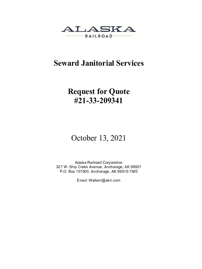 Seward Janitorial Services Request for Quote #2133209341October 13, 2021 Alaska Railroad Corporation 327 W. Ship Creek Avenue, Anchorage, AK 99501 P.O. Box 107500, Anchorage, AK 995107500 Email: Walker×AKR.