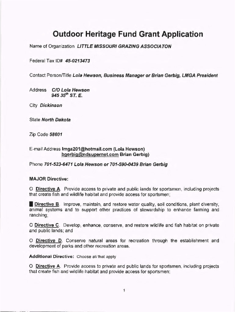 Outdoor Heritage Fund Grant Application Name of Organization LITTLE MISSOURI GRAZING ASSOC/TON Federal Tax ID# 450213473 Contact Person! Title Lola Henson, Business Manager or Brian Gerbil, LGA President