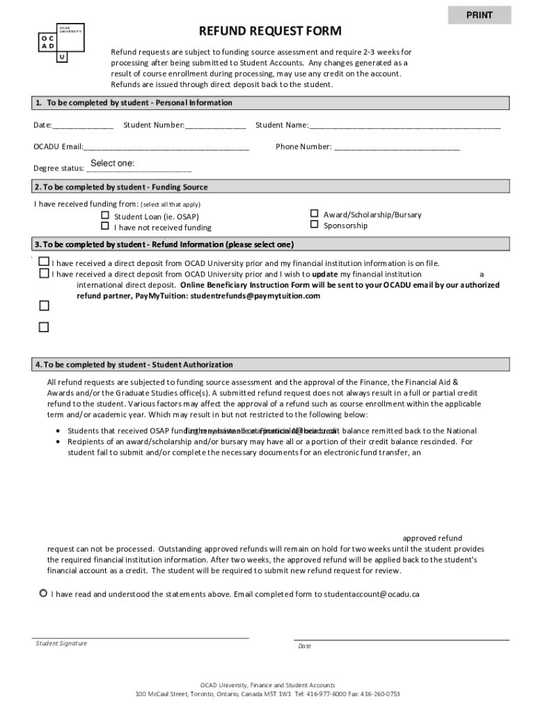PRINTREFUND REQUEST FORM Refund requests are subject to funding source assessment and require 23 weeks for processing after being submitted to Student Accounts. Any changes generated as a result of