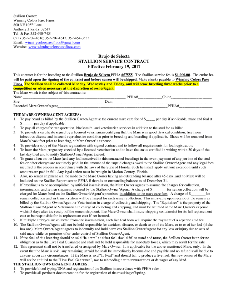 Get the free Brujo de Selecta STALLION SERVICE CONTRACT Effective ...