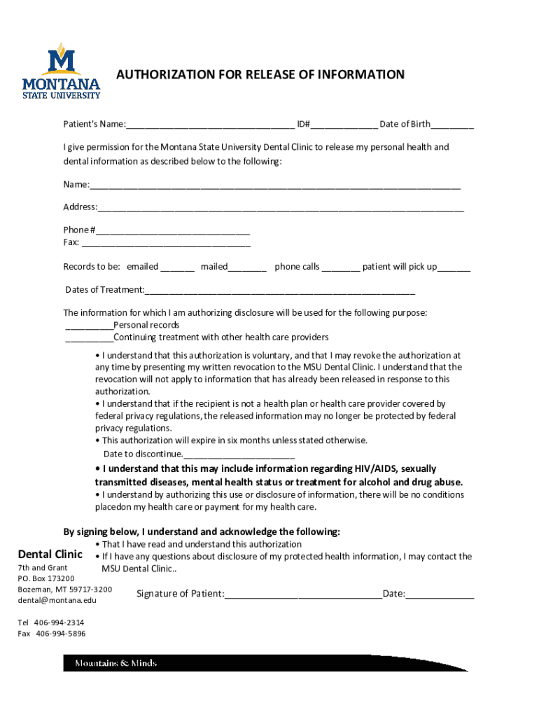 AUTHORIZATION FOR RELEASE OF INFORMATIONPatient\'s Name:___ ID#___ Date of Birth___ I give permission for the Montana State University Dental Clinic to release my personal health and dental information