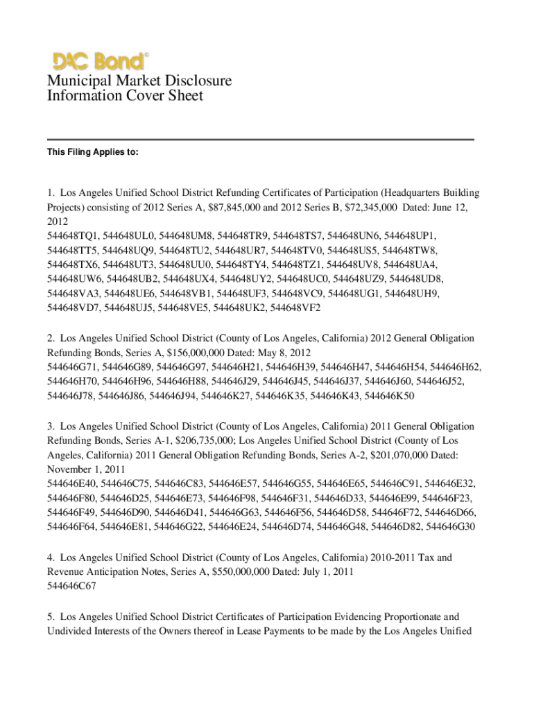 Municipal Market Disclosure Information Cover Sheets Filing Applies to:1. Los Angeles Unified School District Refunding Certificates of Participation (Headquarters Building Projects) consisting of