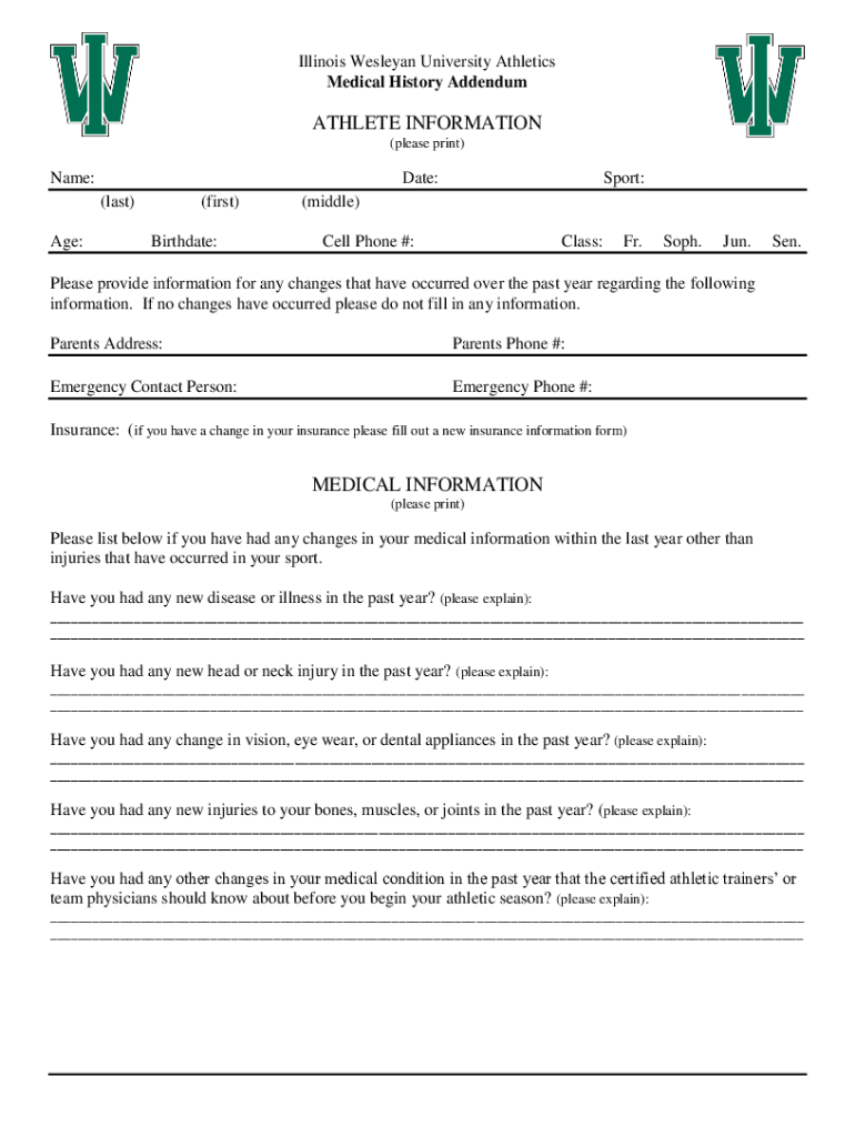 Illinois Wesleyan University Athletics Medical History AddendumATHLETE INFORMATION (please print)Name:Date: (last)Age:(first) Birthdate:Sport:(middle) Cell Phone #:Class:Fr. Soph. Jun. Sen. Please