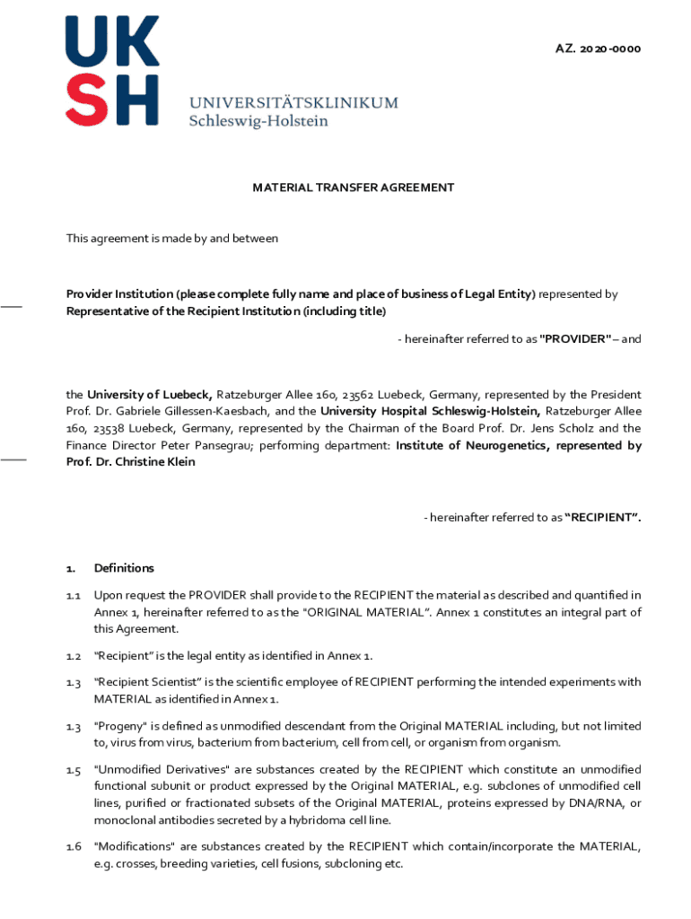AZ. 20200000MATERIAL TRANSFER Agreements agreement is made by and betweenProvider Institution (please complete fully name and place of business of Legal Entity) represented by Representative of the
