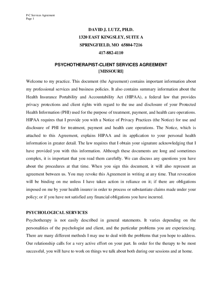 PC Services Agreement Page 1DAVID J. LUTZ, Ph.D. 1320 EAST KINGSLEY, SUITE A SPRINGFIELD, MO 658047216 4178824110 PSYCHOTHERAPISTCLIENT SERVICES AGREEMENT [MISSOURI] Welcome to my practice. This document