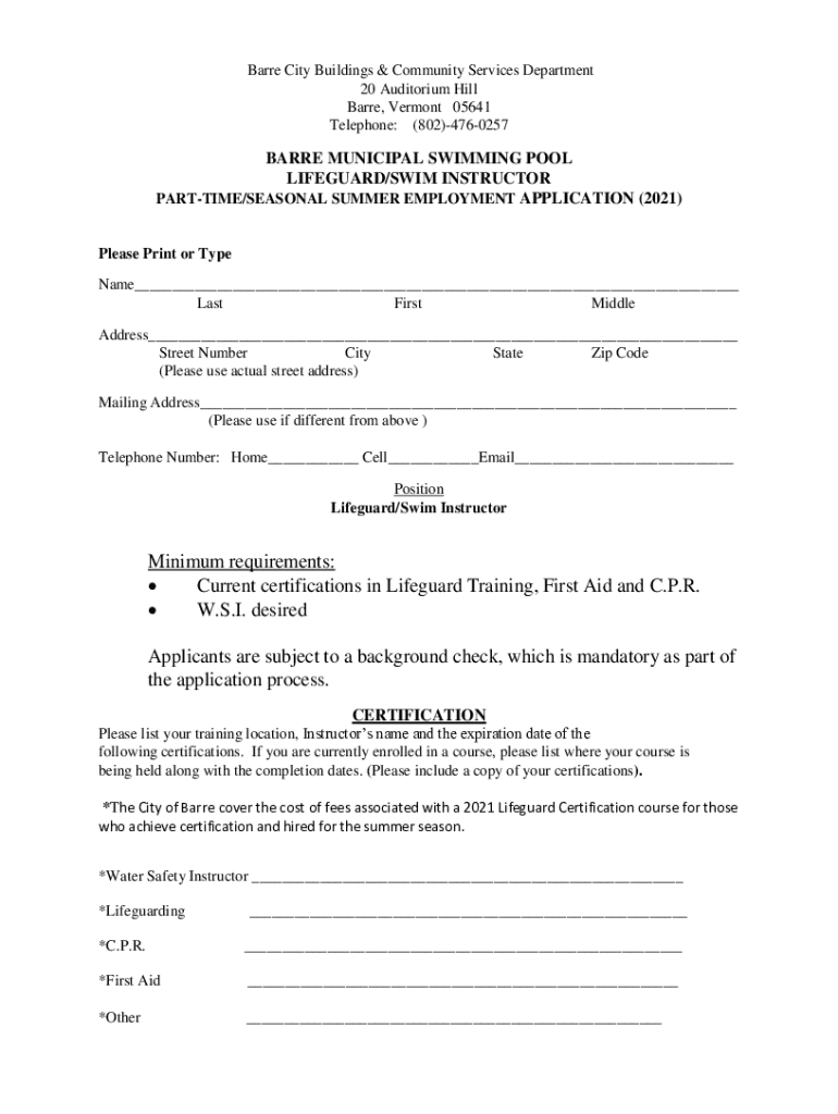 Barre City Buildings & Community Services Department 20 Auditorium Hill Barre, Vermont 05641 Telephone: (802)4760257BARRE MUNICIPAL SWIMMING POOL LIFEGUARD/SWIM INSTRUCTOR PART TIME/SEASONAL SUMMER