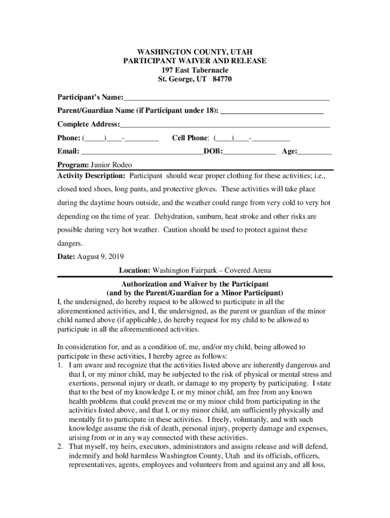 WASHINGTON COUNTY, UTAH PARTICIPANT WAIVER AND RELEASE 197 East Tabernacle St. George, UT 84770 Participants Name:___ Parent/Guardian Name (if Participant under 18): ___ Complete Address:___ Phone: