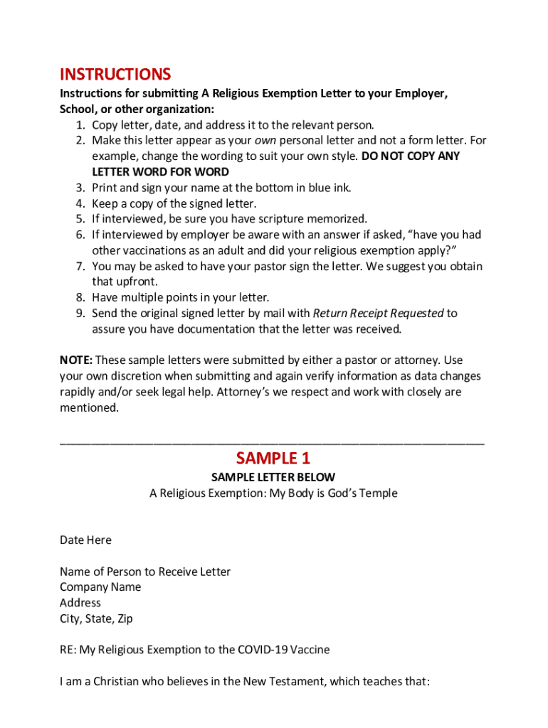 INSTRUCTIONS for submitting A Religious Exemption Letter to your Employer, School, or other organization: 1. Copy letter, date, and address it to the relevant person. 2. Make this letter appear as