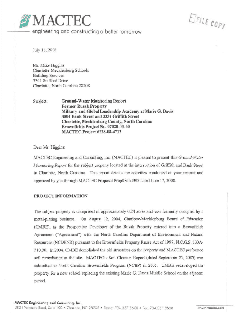 L/MAC TEC engineering and constructing a better tomorrow July 18, 2008Mr. Mike Higgins CharlotteMecklenburg Schools Building Services 3301 Stafford Drive Charlotte, North Carolina 28208Subject:Groundwater