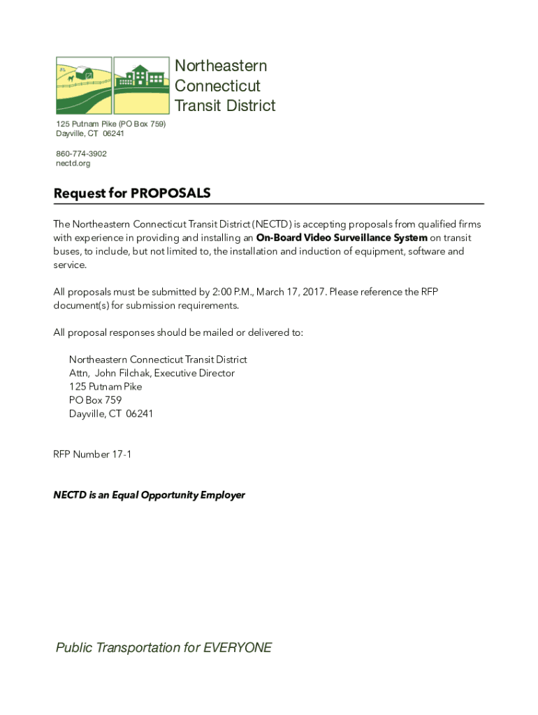 NortheasternConnecticutTransit District 125 Putnam Pike (PO Box 759)Danville, CT 062418607743902nectd. Request for PROPOSALS The Northeastern Connecticut Transit District (ECTD) is accepting proposals