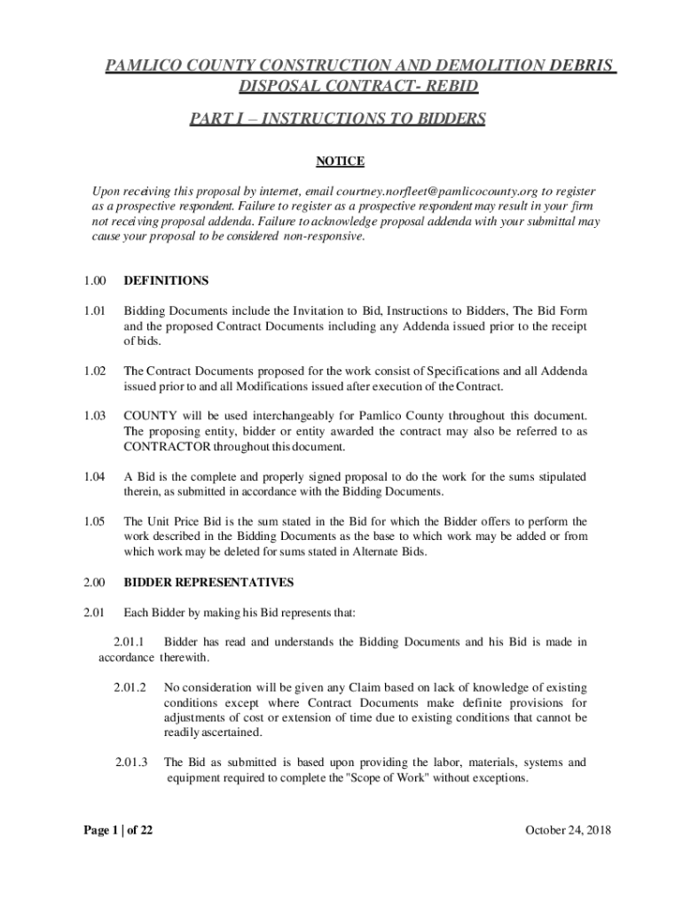 CALICO COUNTY CONSTRUCTION AND DEMOLITION DEBRIS DISPOSAL CONTRACT REBID PART I INSTRUCTIONS TO BIDDERS NOTICEUpon receiving this proposal by internet, email Courtney. Nor fleet×pamlicocounty.org