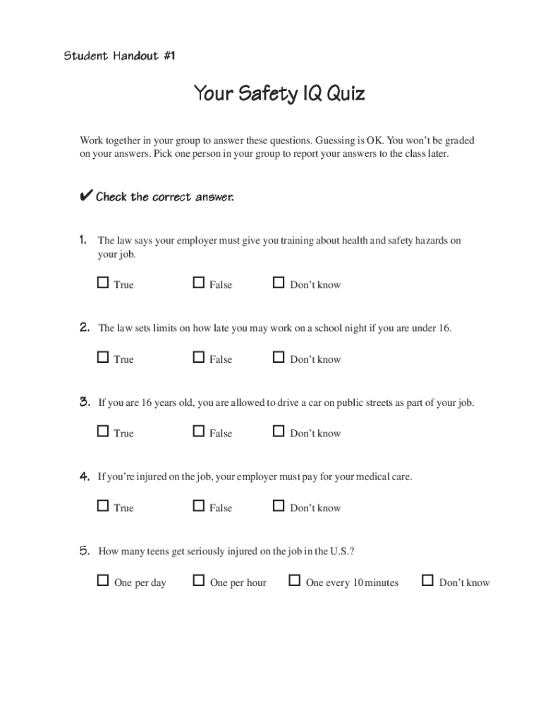 Student Handout #1Your Safety IQ Quiz Safety Work together in your group to answer these questions. Guessing is OK. You won't be graded on your answers. Pick one person in your group to report your