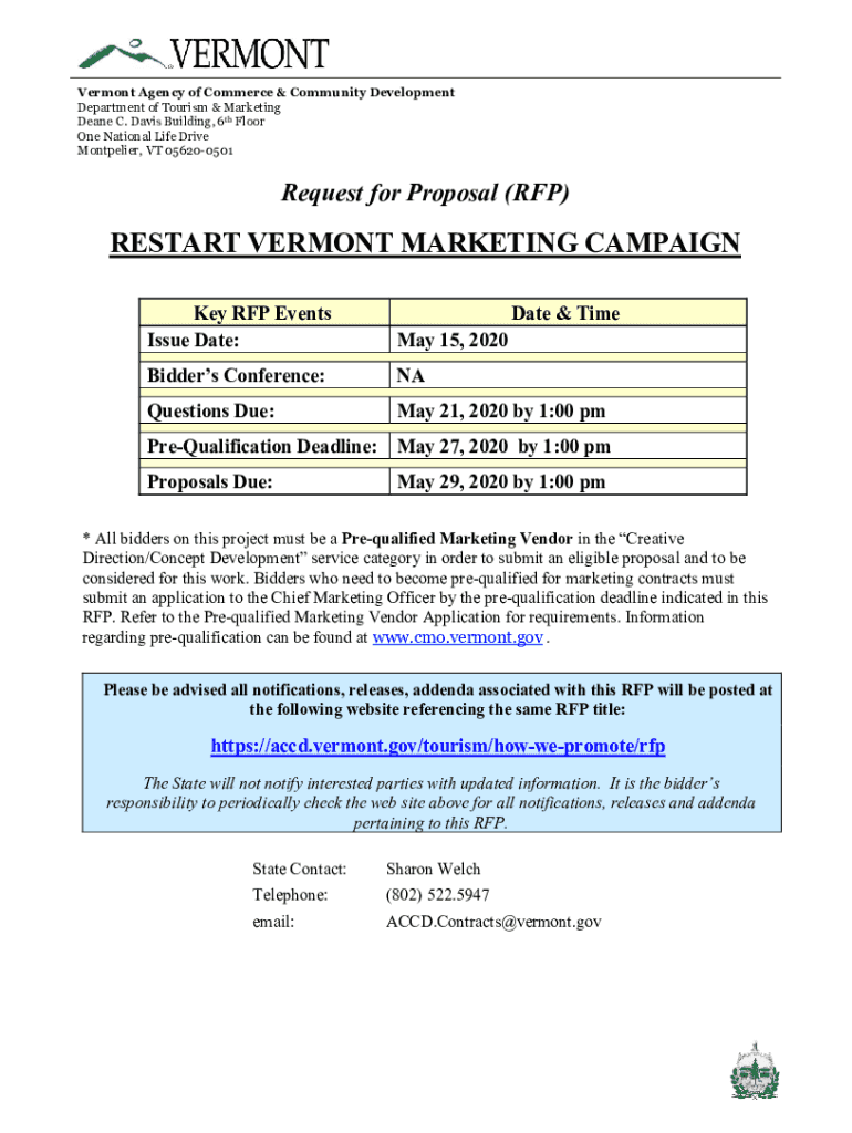 Vermont Agency of Commerce & Community Development Department of Tourism & Marketing Dean C. Davis Building, 6th Floor One National Life Drive Montpelier, VT 056200501Request for Proposal (RFP)RESTART