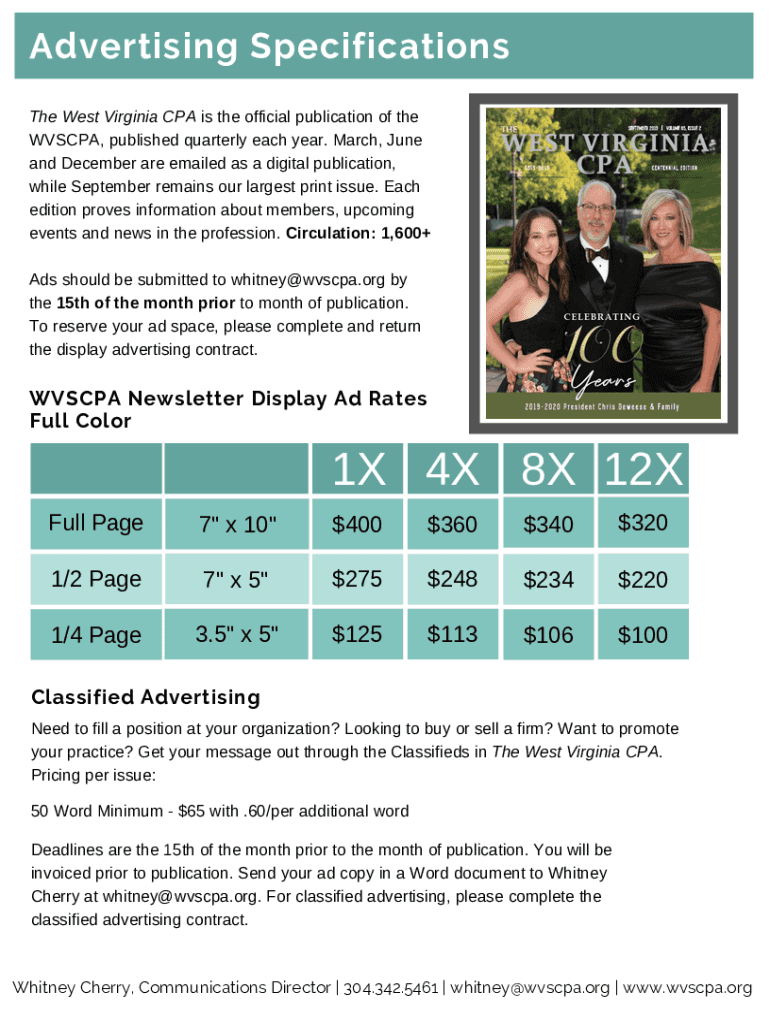 Advertising Specifications The West Virginia CPA is the official publication of the WISPA, published quarterly each year. March, June and December are emailed as a digital publication, while September