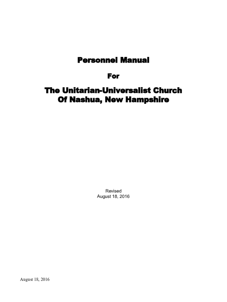 PersonnelManual For TheUnitarianUniversalistChurch Of Nashua, NewHampshireRevised August 18, 2016August 18, 2016DATECHANGE HISTORY CHANGE SUMMARY October 28, 2009, May 30, 2014, February 9, 2015,