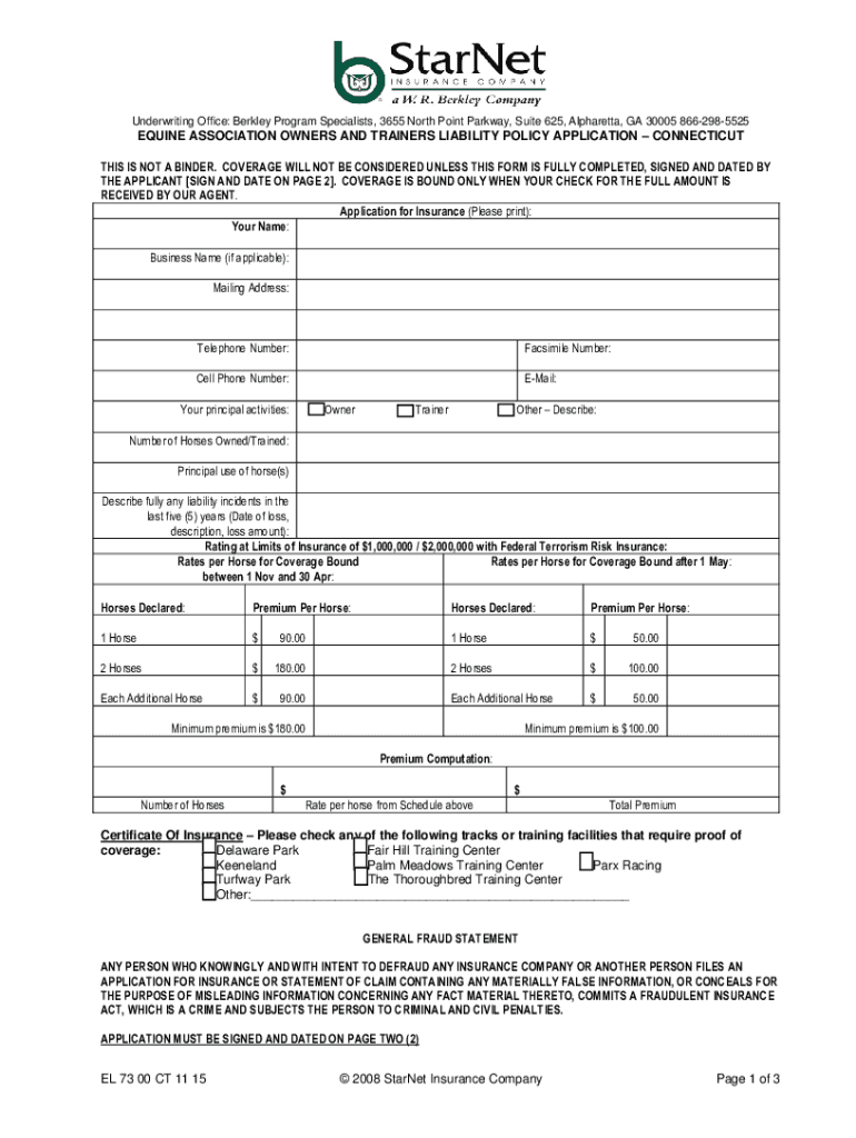 Underwriting Office: Berkley Program Specialists, 3655 North Point Parkway, Suite 625, Alpharetta, GA 30005 8662985525EQUINE ASSOCIATION OWNERS AND TRAINERS LIABILITY POLICY APPLICATION CONNECTICUT