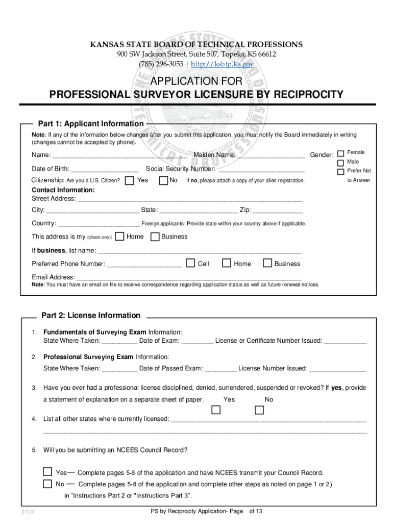 KANSAS STATE BOARD OF TECHNICAL PROFESSIONS 900 SW Jackson Street, Suite 507, Topeka, KS 66612 (785) 2963053 | http://ksbtp.ks.govAPPLICATION FOR PROFESSIONAL SURVEYOR LICENSURE BY RECIPROCITY INSTRUCTIONS