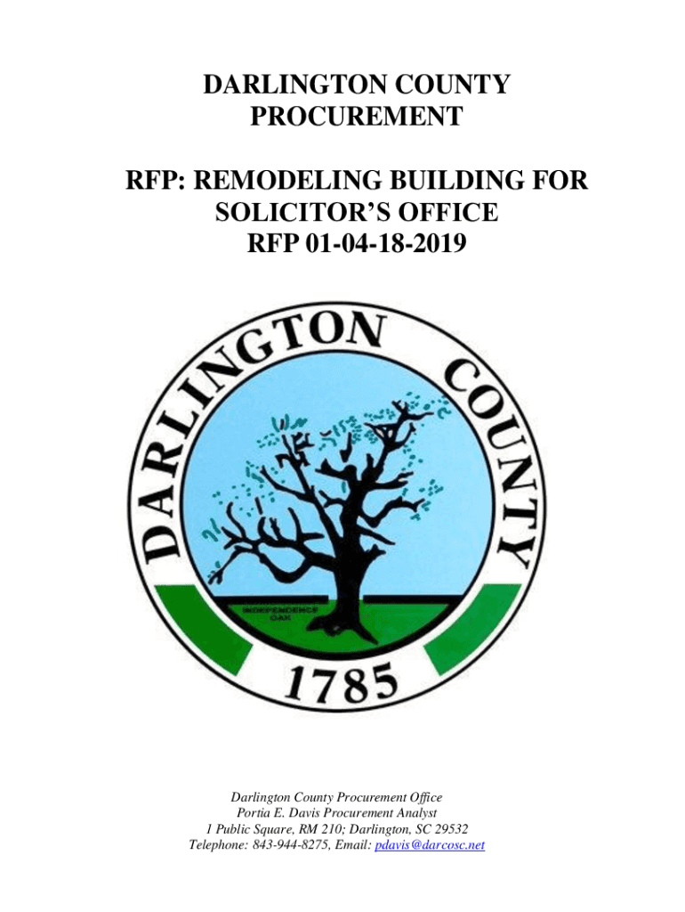 DARLINGTON COUNTY PROCUREMENT RFP: REMODELING BUILDING FOR SOLICITORS OFFICE RFP 0104182019Darlington County Procurement Office Portia E. Davis Procurement Analyst 1 Public Square, RM 210; Darlington,