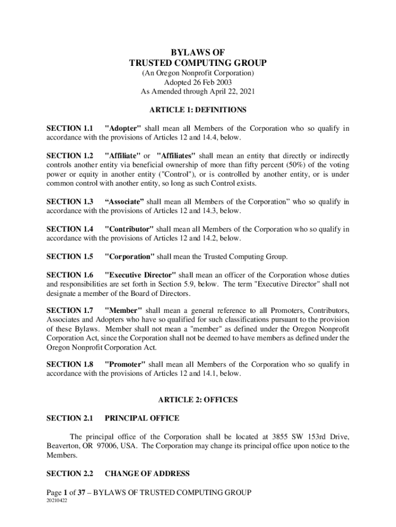 BYLAWS OF TRUSTED COMPUTING GROUP (An Oregon Nonprofit Corporation) Adopted 26 Feb 2003 As Amended through April 22, 2021, ARTICLE 1: DEFINITIONS SECTION 1.1 \” Adopter\” shall mean all Members