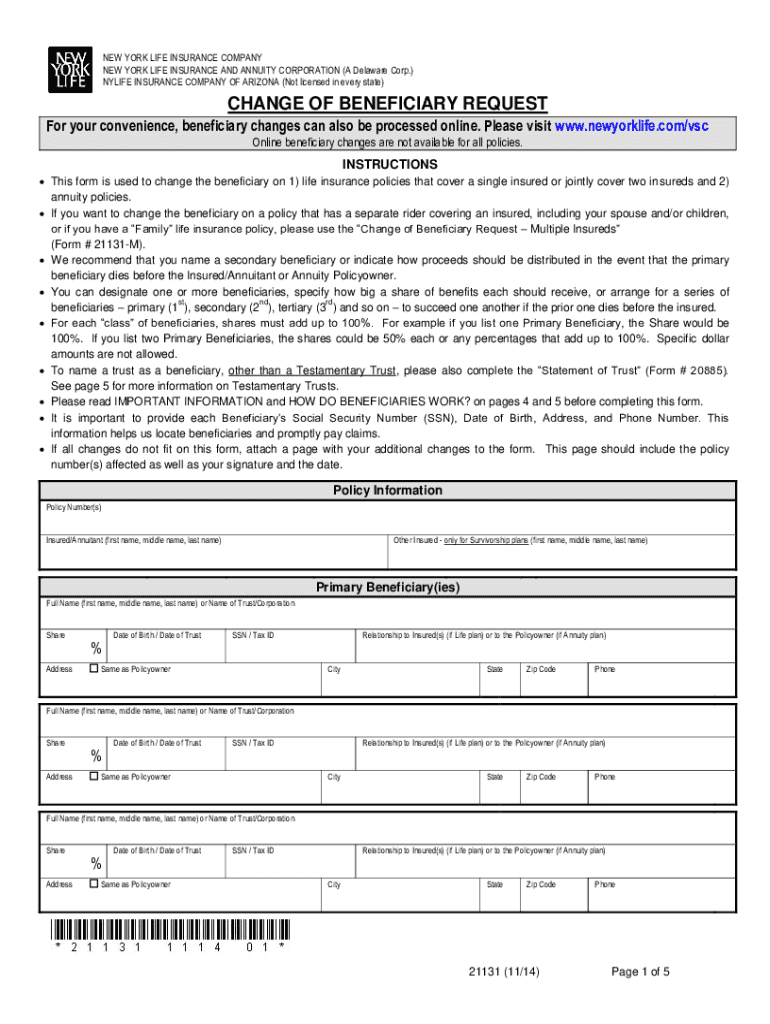 NEW YORK LIFE INSURANCE COMPANY NEW YORK LIFE INSURANCE AND ANNUITY CORPORATION (A Delaware Corp.) LIFE INSURANCE COMPANY OF ARIZONA (Not licensed in every state)CHANGE OF BENEFICIARY REQUEST For