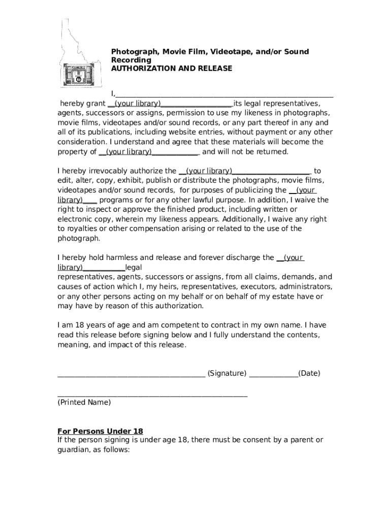 The brevardfp.orgwp-contentuploadsPhotograph, Movie Film, Videotape, and/or Sound Recording ... - libraries idaho is a writable document that has to be filled-out and signed for specific purposes. In that case, it is furnished to the relevant addressee to provide specific details of any kinds. The completion and signing is able in hard copy by hand or with a suitable service e. g. PDFfiller. These tools help to submit any PDF or Word file without printing out. It also allows you to edit its appearance depending on your needs and put a valid digital signature. Once you're good, you send the brevardfp.orgwp-contentuploadsPhotograph, Movie Film, Videotape, and/or Sound Recording ... - libraries idaho to the respective recipient or several recipients by email and also fax. PDFfiller is known for a feature and options that make your Word form printable. It includes a number of settings when printing out. It does no matter how you will send a form after filling it out - in hard copy or by email - it will always look professional and organized. In order not to create a new writable document from scratch every time, make the original Word file into a template. Later, you will have a customizable sample.