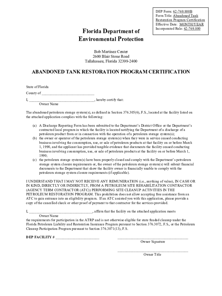 Florida Department of Environmental Protection DEP Form: 62769.800B Form Title: Abandoned Tank Restoration Program Certification Effective Date: MONTH/YEAR Incorporated Rule: 62769.800Bob Martinez