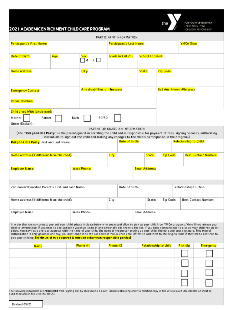 2021 ACADEMIC ENRICHMENT CHILD CARE PROGRAM PARTICIPANT INFORMATION Participants First Name:Date of birth:Participants Last Name:Age:Sex: Grade in Fall 21:YMCA Site:School Enrolled:Home address:City:State:Emergency