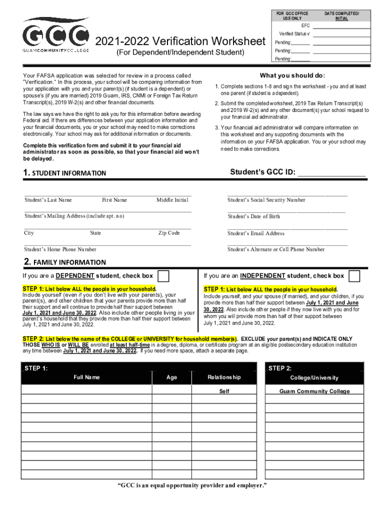 FOR GCC OFFICE USE VALIDATE COMPLETED/ INITIALEFC20212022 Verification Worksheet (For Dependent/Independent Student)Your FAFSA application was selected for review in a process called Verification.