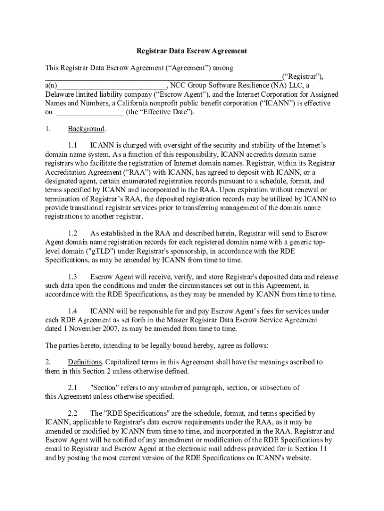 Registrar Data Escrow Agreement This Registrar Data Escrow Agreement (Agreement) among ___(Registrar), a(n)___, NCC Group Software Resilience (NA) LLC, a Delaware limited liability company (Escrow